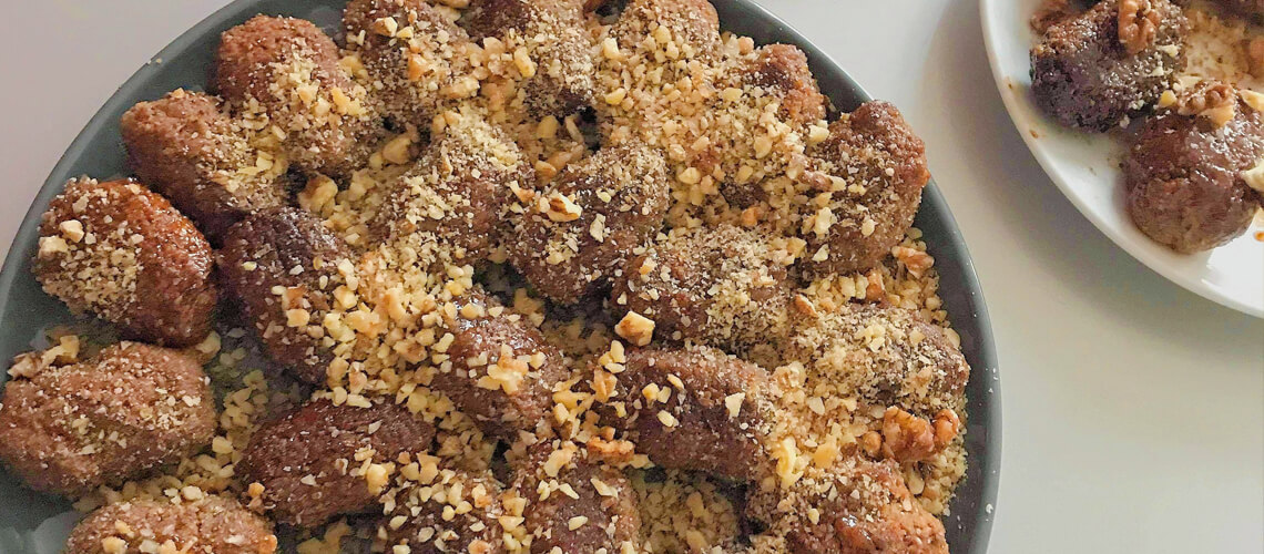 Και τα προσθέτετε στο υγρό μείγμα και ανακατεύετε καλά. Φτιάχνετε τα μελομακάρονα και ψήνετε για 20- 30 λεπτά σε προθερμασμένο φούρνο στους 180 βαθμούς.